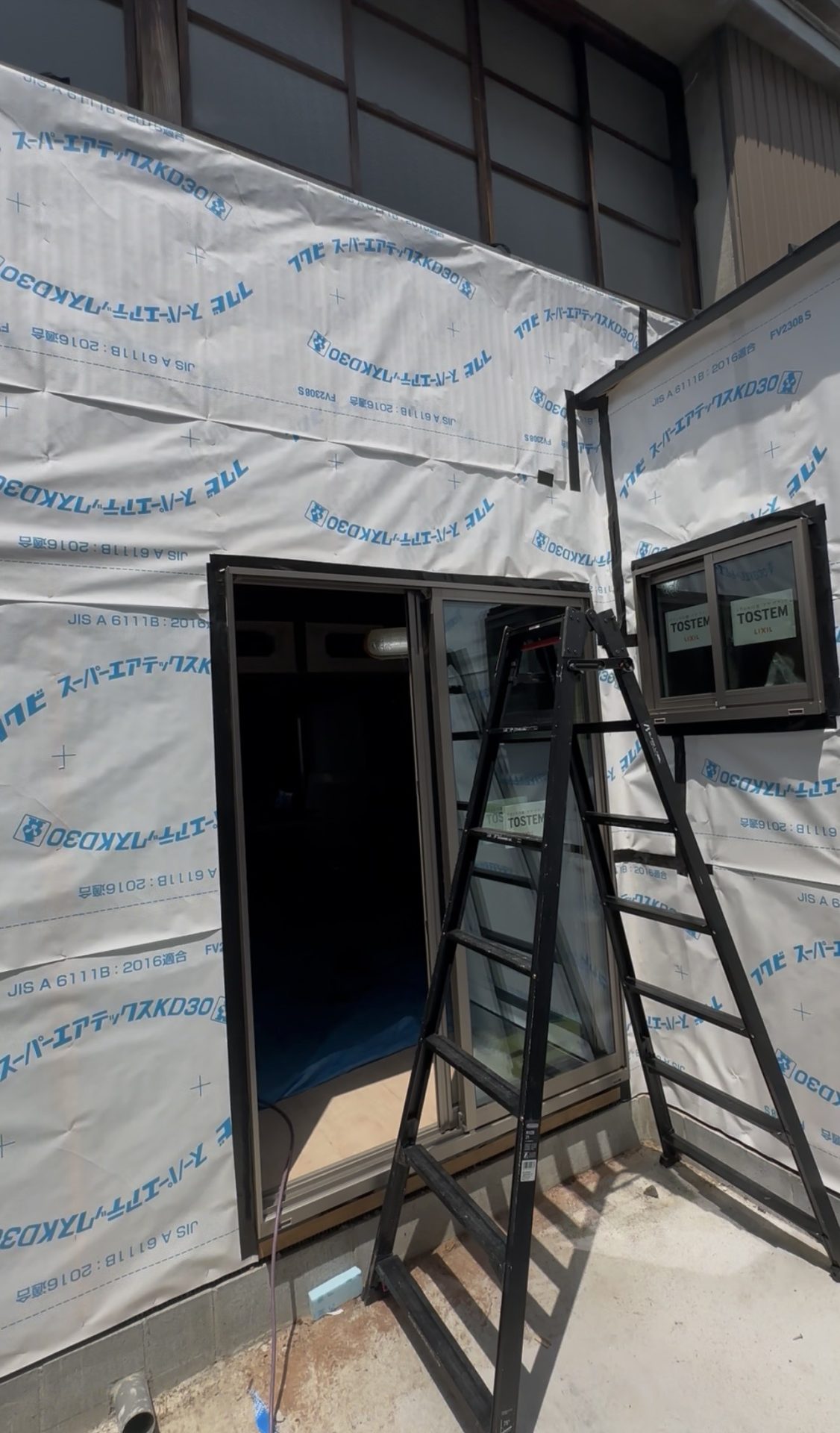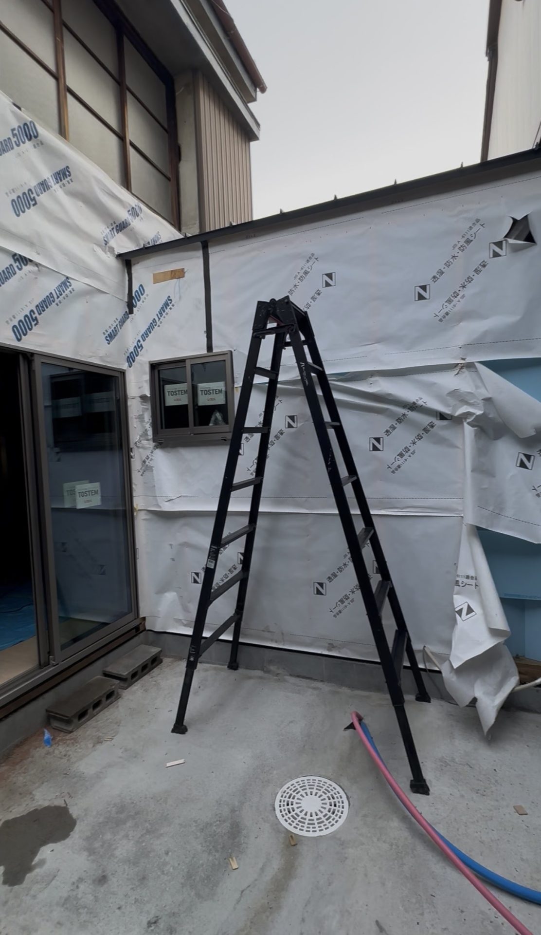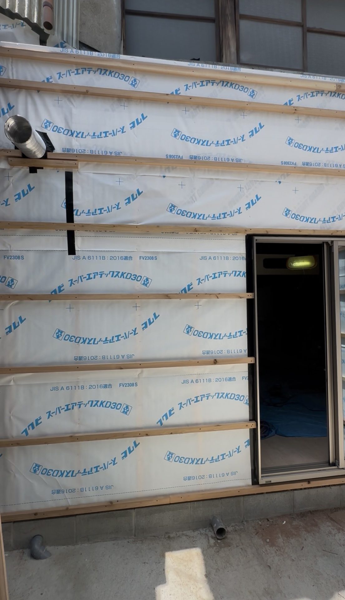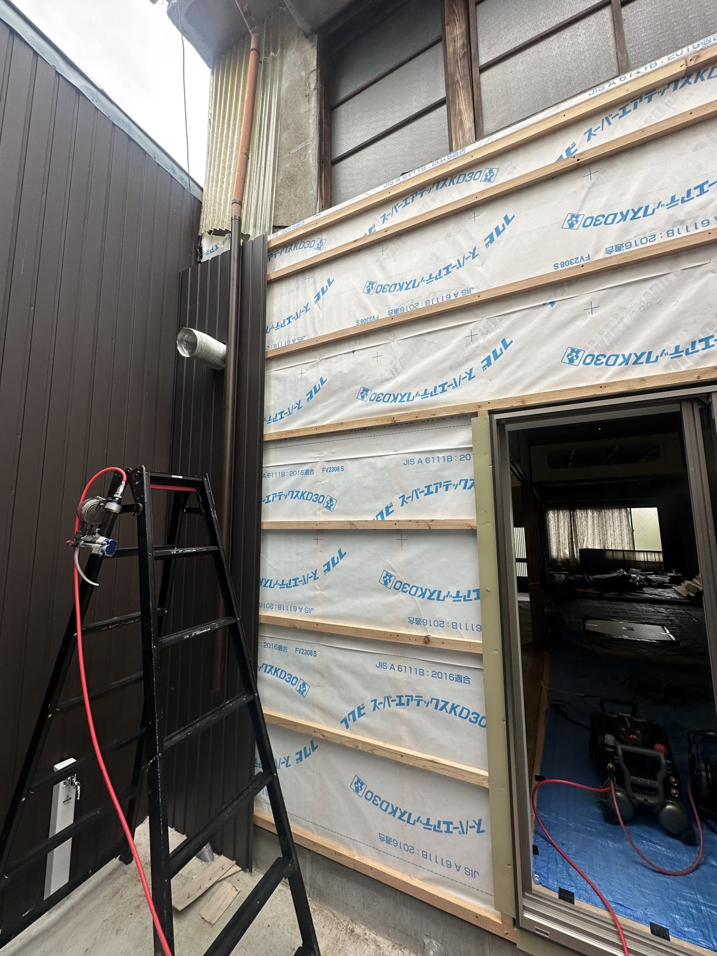 まずは外壁全体に防水シートを丁寧に貼り、下地となる胴縁(木下地)をしっかりと打ち付けていきます。