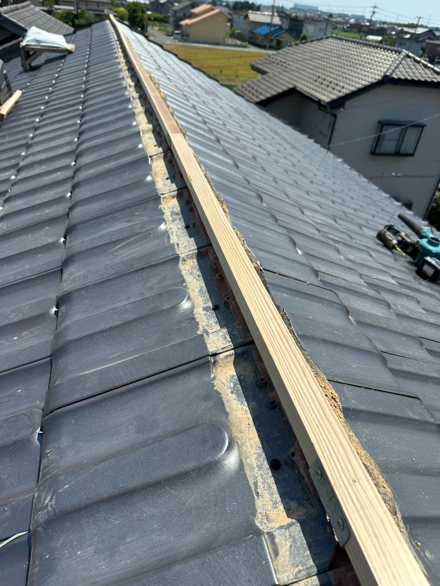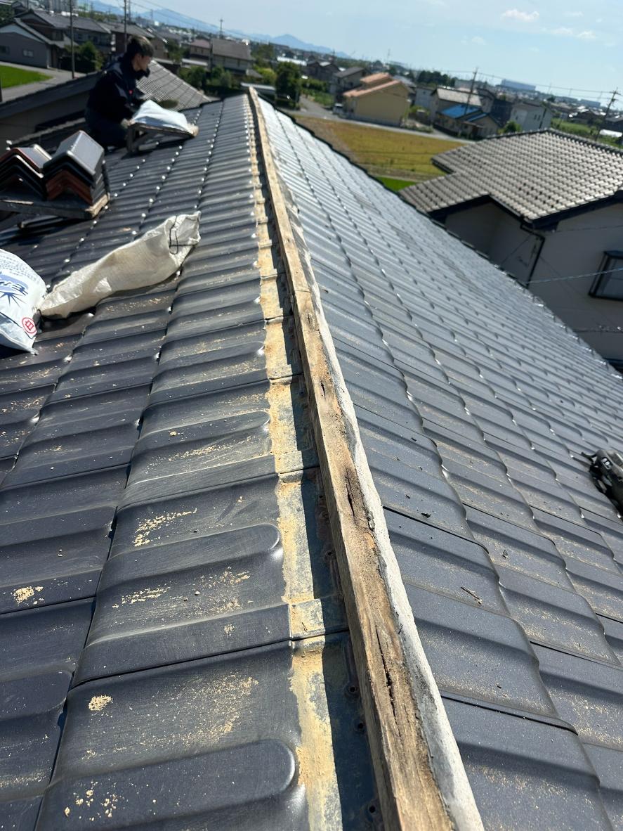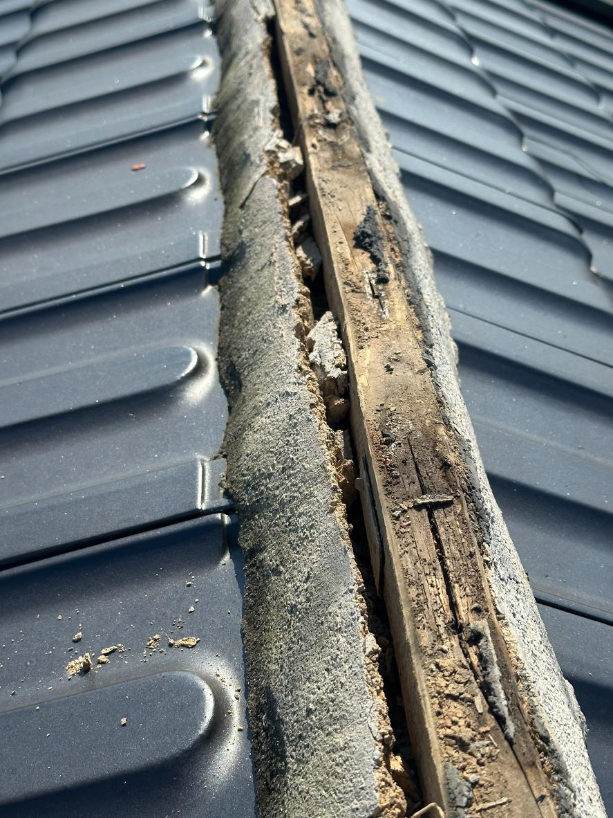 棟瓦部分も、釘の浮きから雨水が侵入し、下地が腐食。中の土もパサパサの状態となっていました。