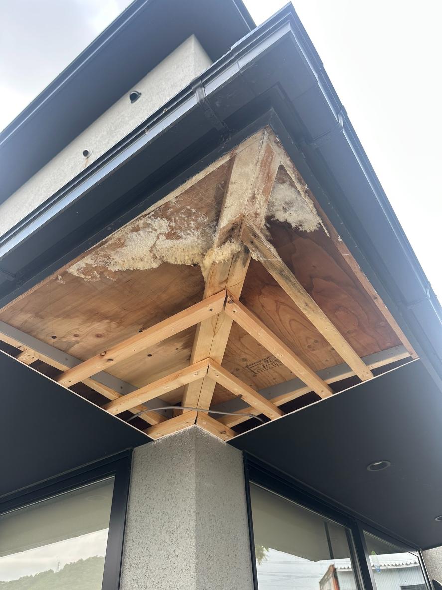 現地を確認したところ、長年の雨漏れにより屋根の下地が腐食しており、軒天まで傷みが広がっている状態でした。
