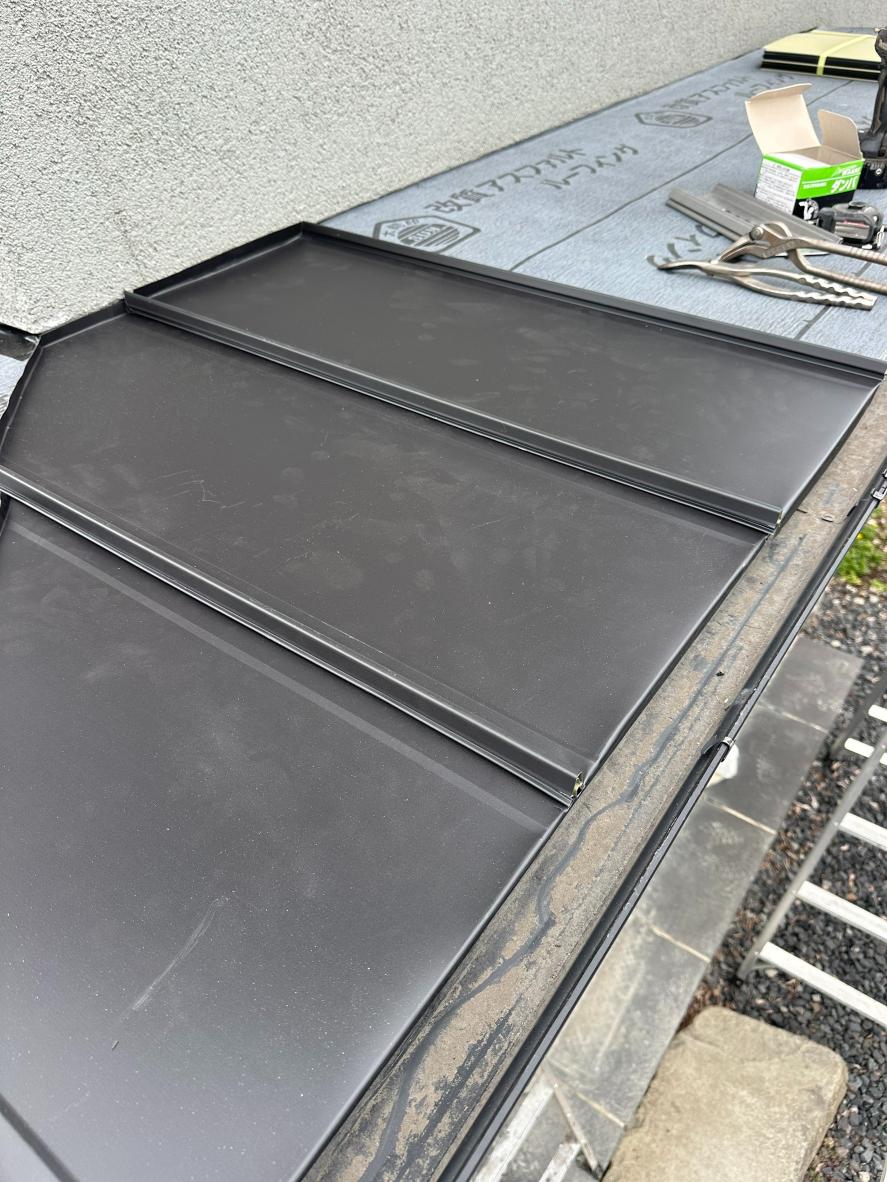 屋根は既存の板金をめくり、傷んでいた下地を新しく交換。その上から立平葺きでカバー施工を行いました。防水性も高まり、今後は安心してお使いいただけます。