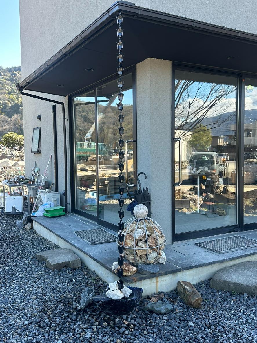 最後に角部分には鎖樋を取り付け、排水も整えて工事完了となりました。